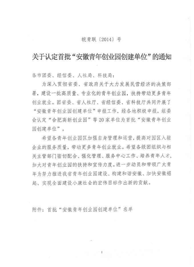 首批“安徽青年創業園創建單位”
