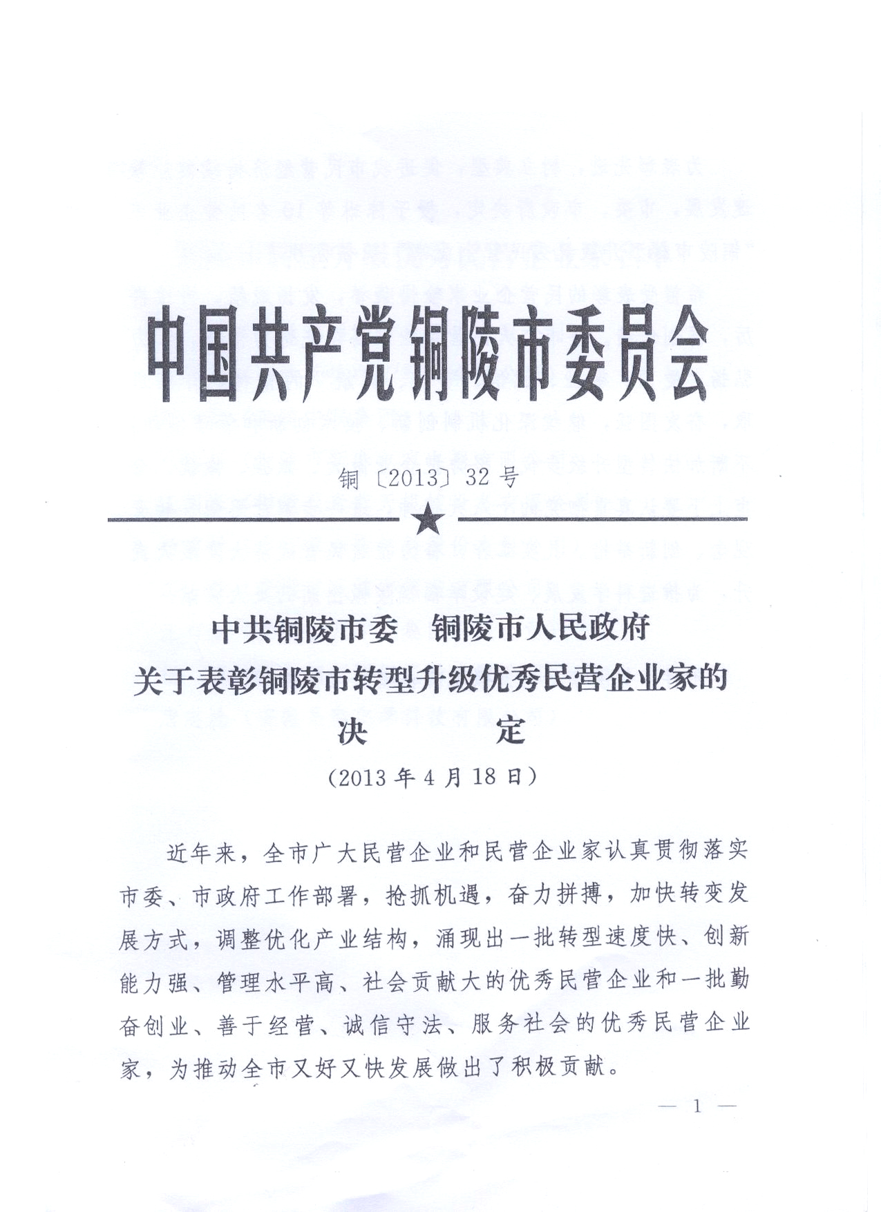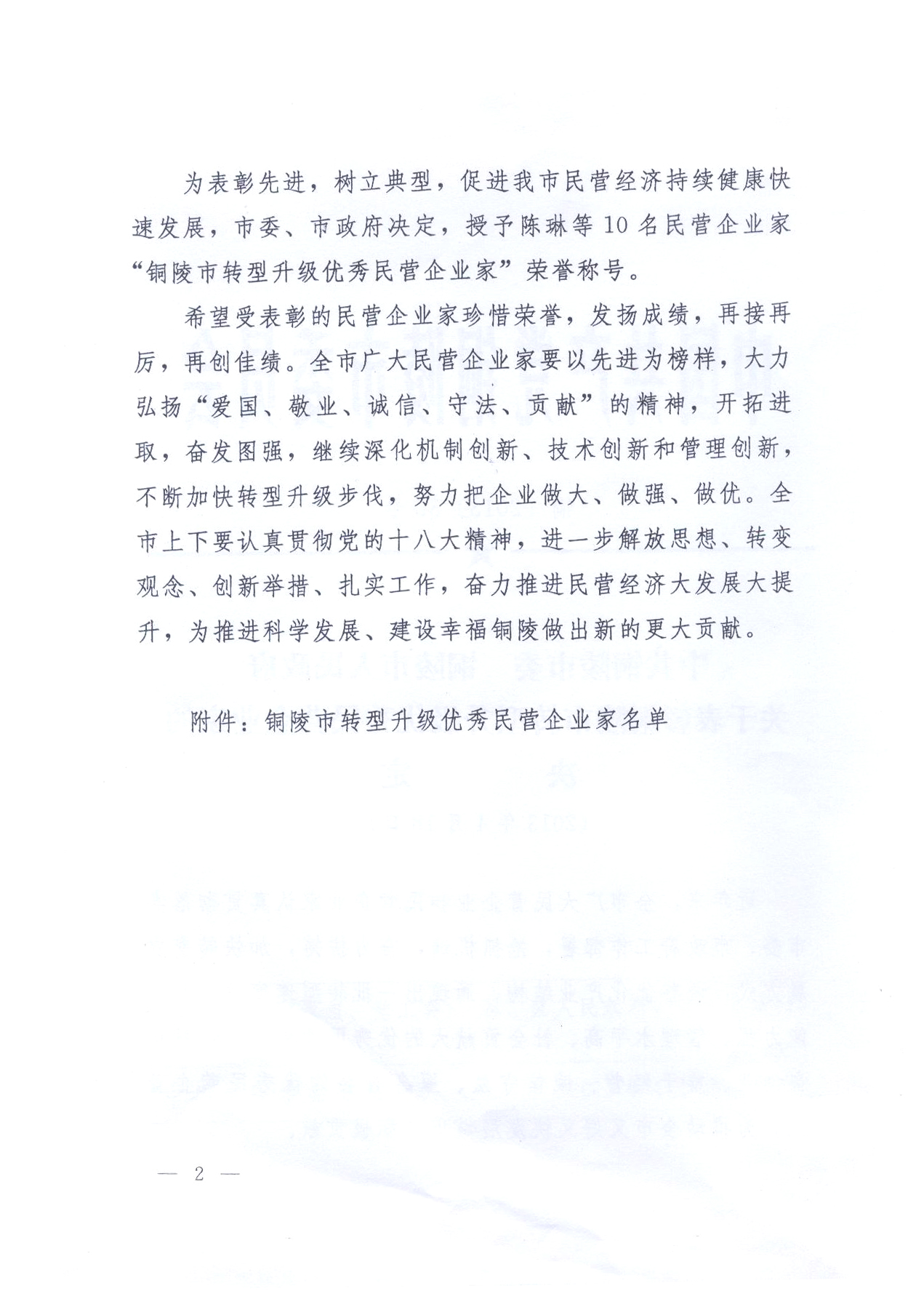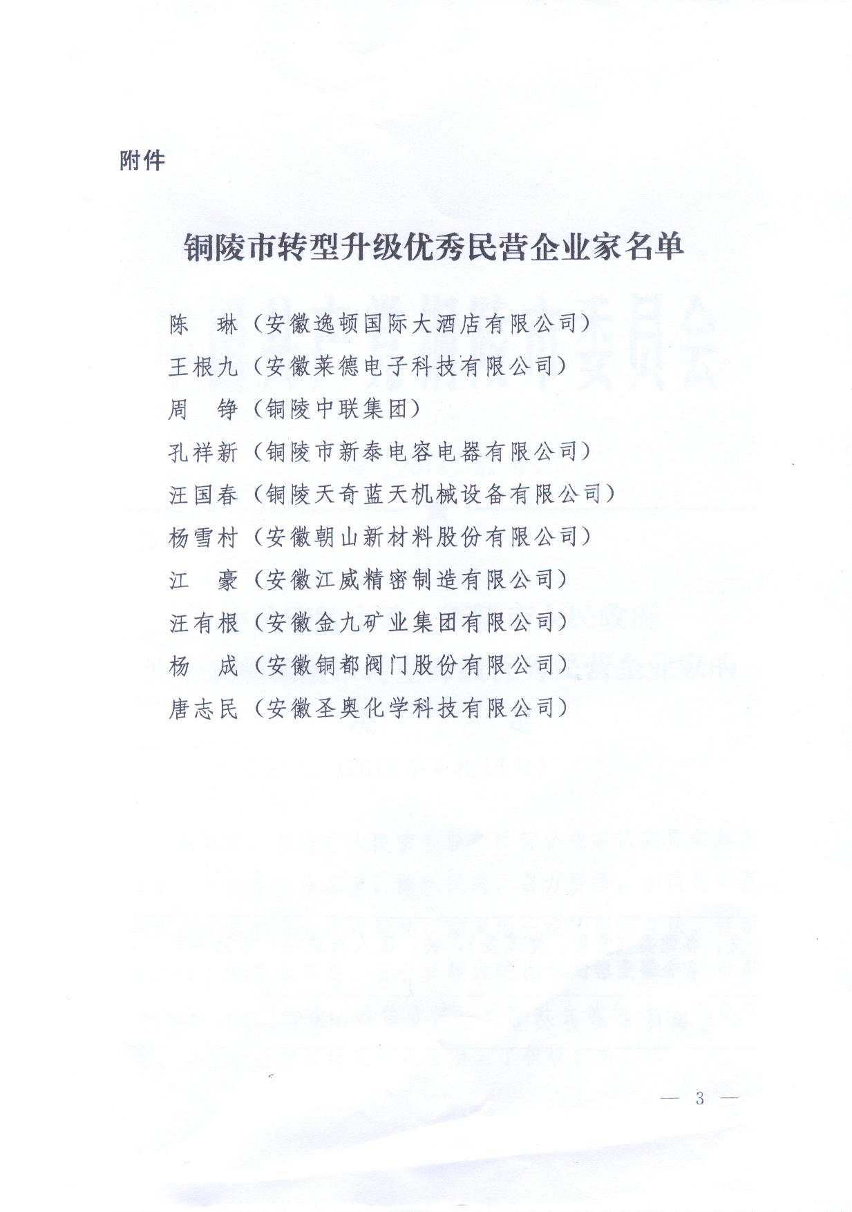 關于表彰銅陵市轉型升級優秀民營企業家的決定